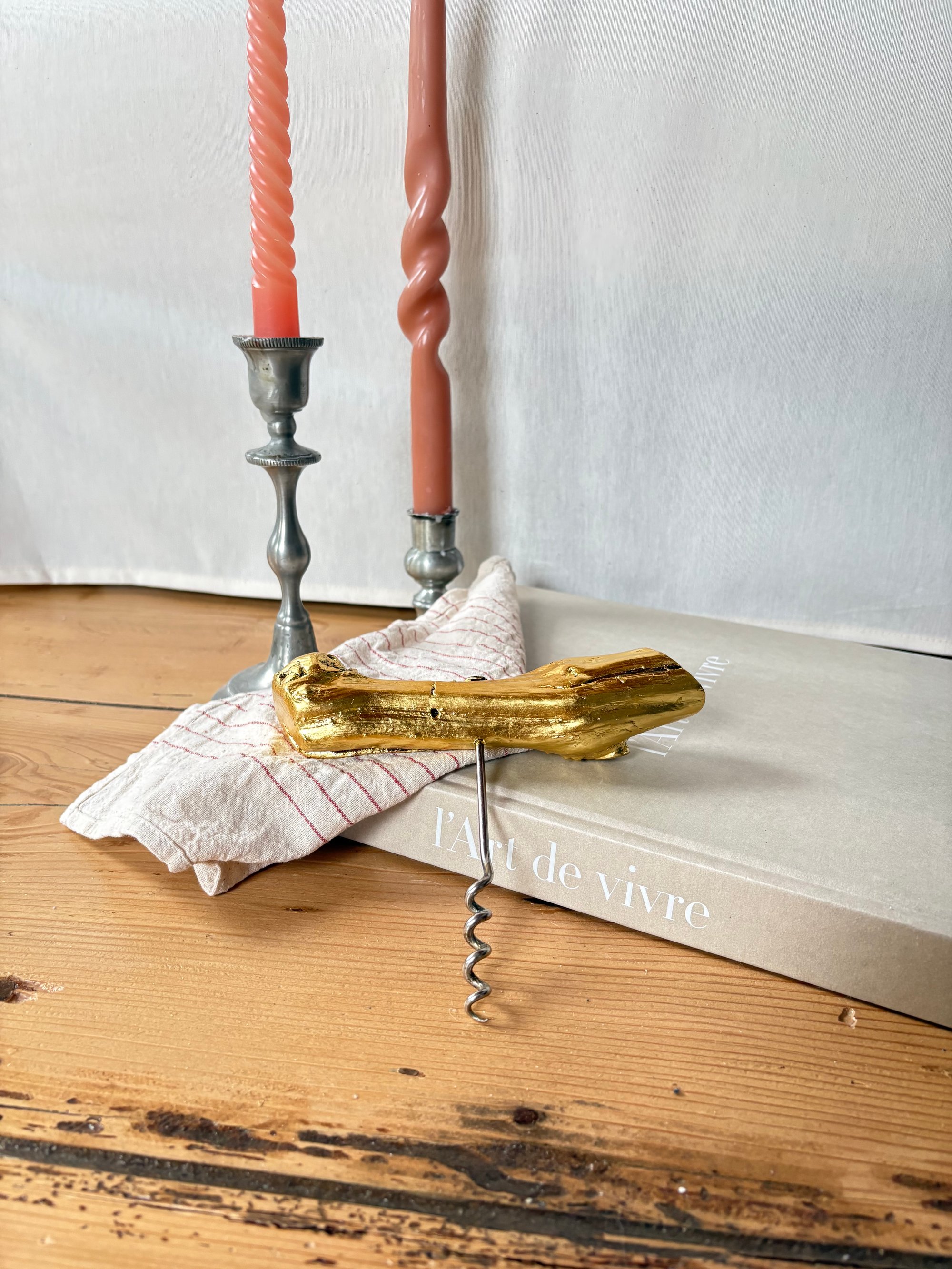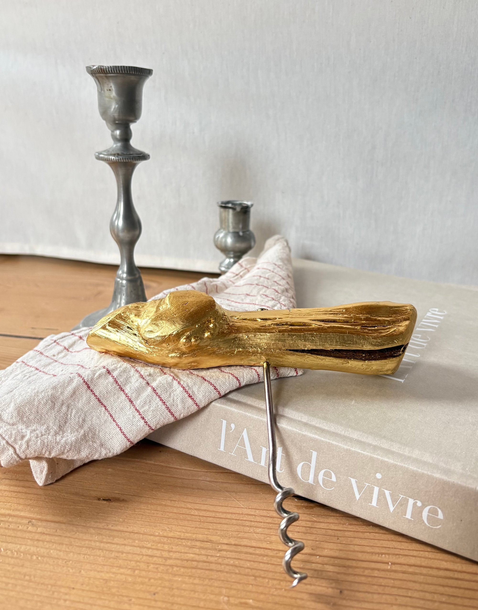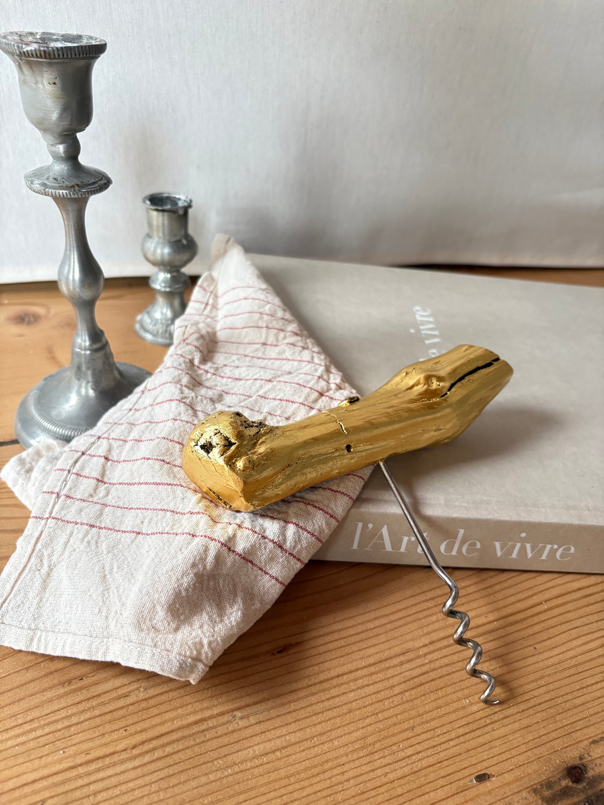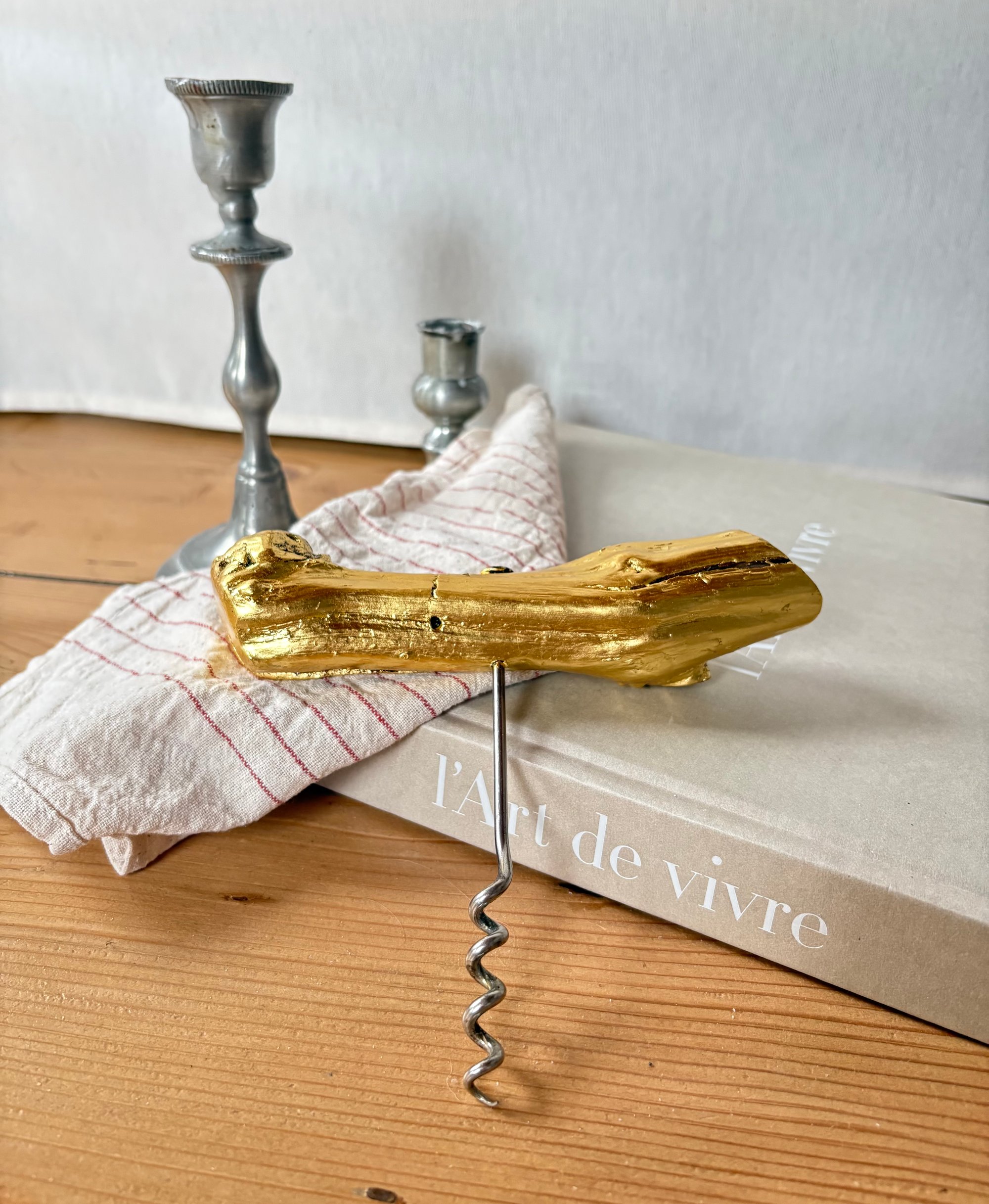 Tire-bouchon vintage en cep pied de vigne, doré à l’or 22,5 carats.