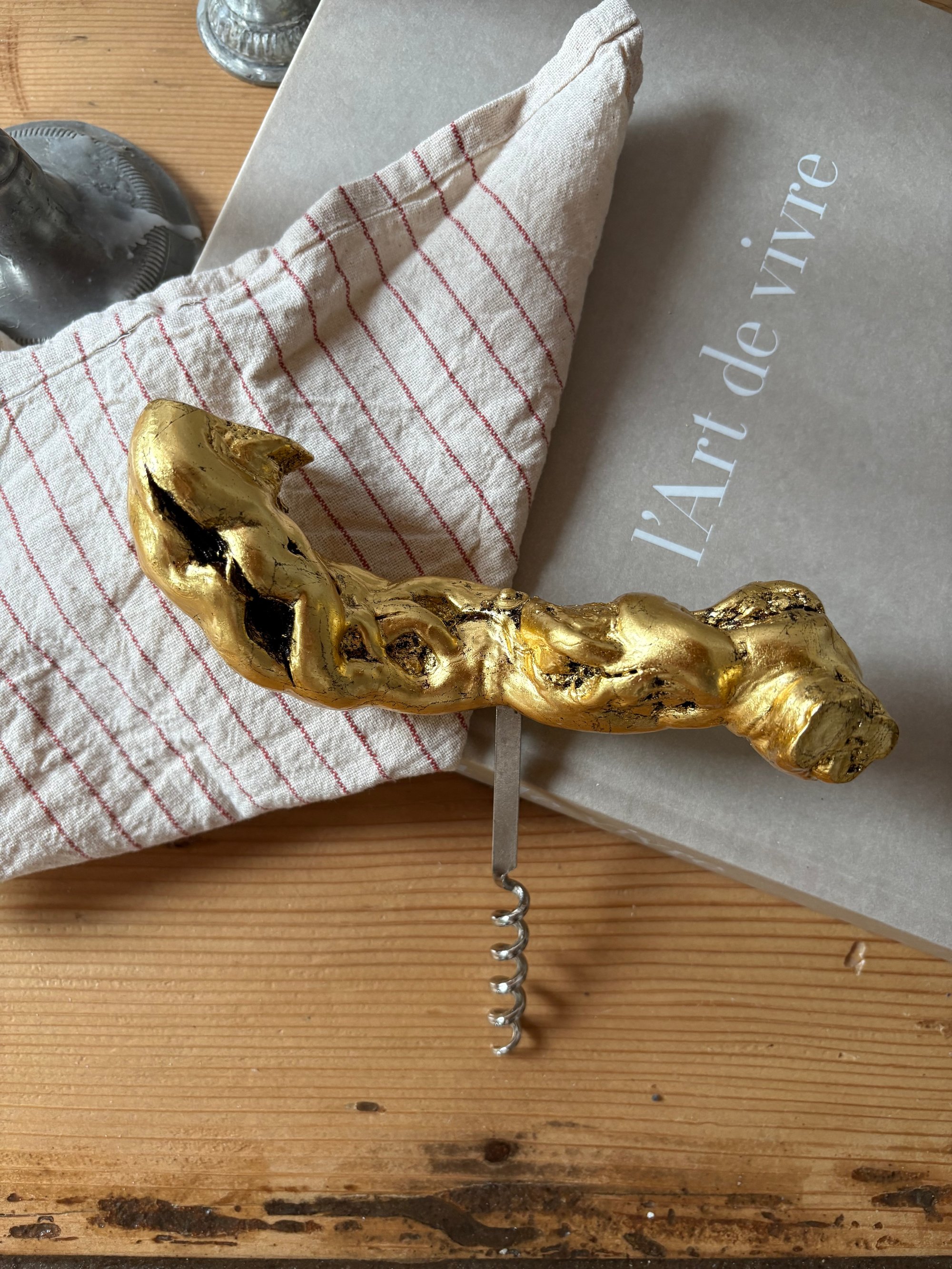 Tire-bouchon vintage en cep pied de vigne, doré à l’or 22,5 carats.